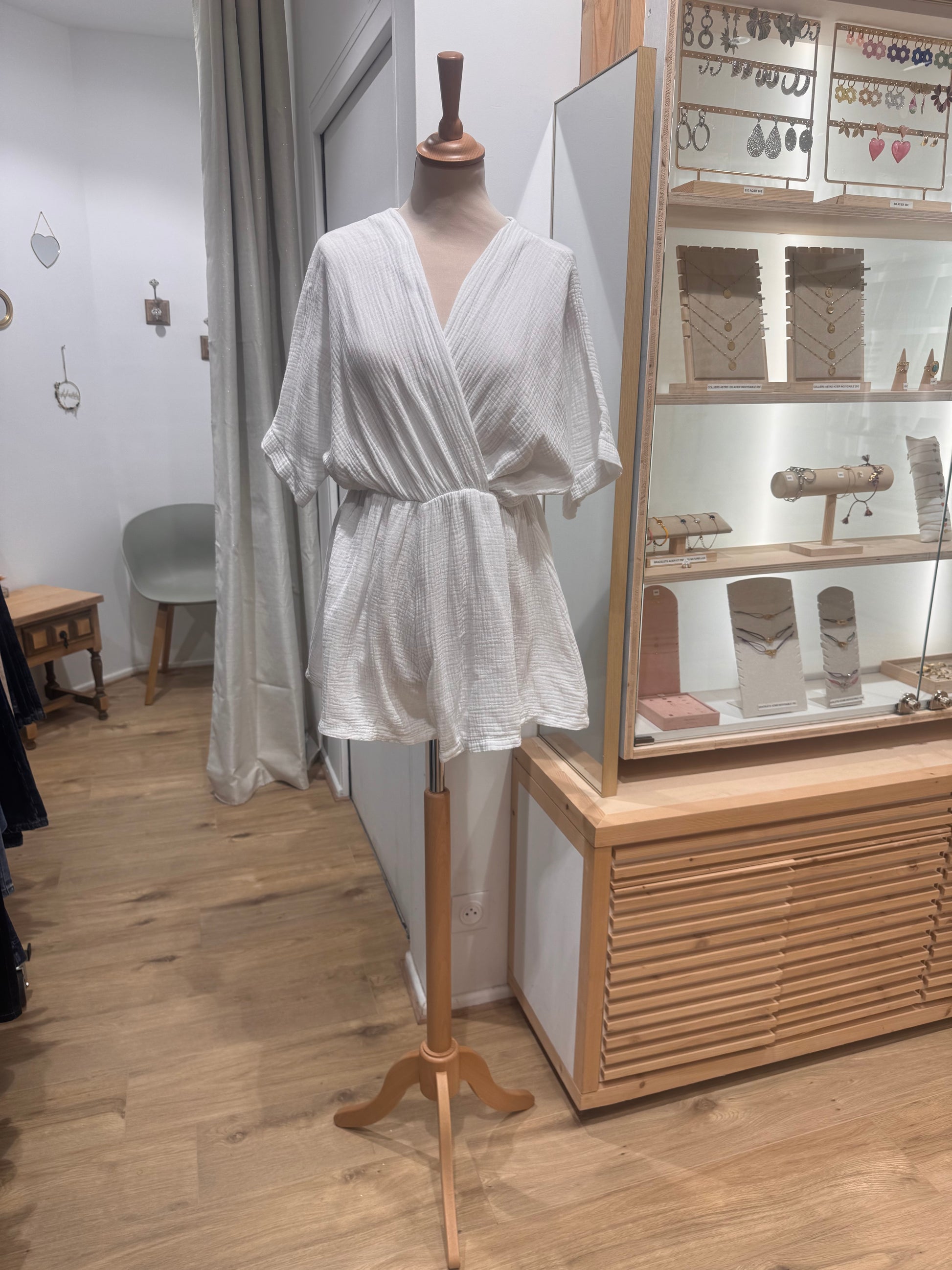 Combishort en gaze de coton 100%, fabriquée en Italie. Idéal pour l'été, ce modèle léger offre confort et style.