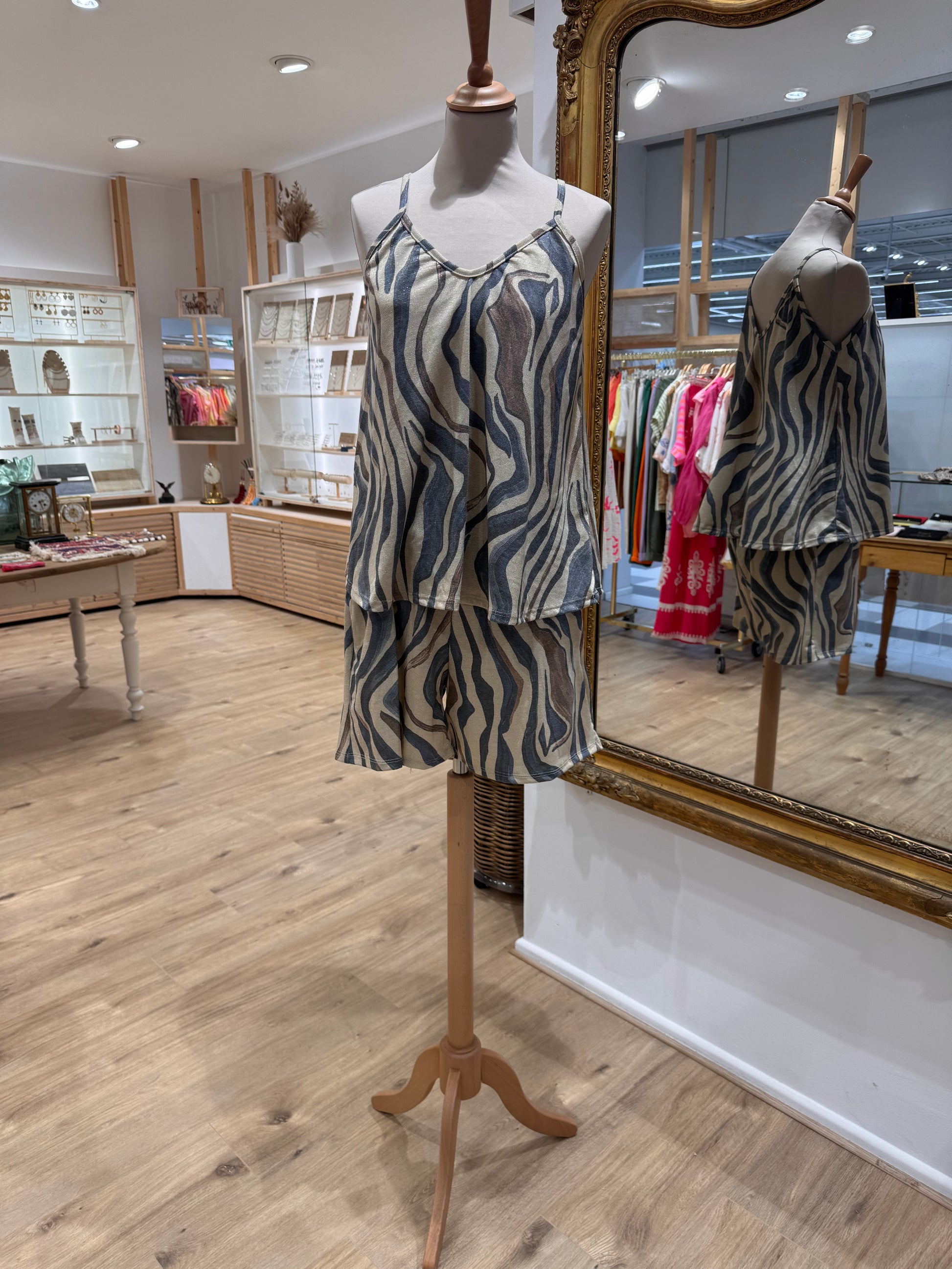 Ensemble débardeur et short en lurex, viscose et élasthanne, idéal pour briller. Fabriqué en Italie, parfait pour la saison festive.